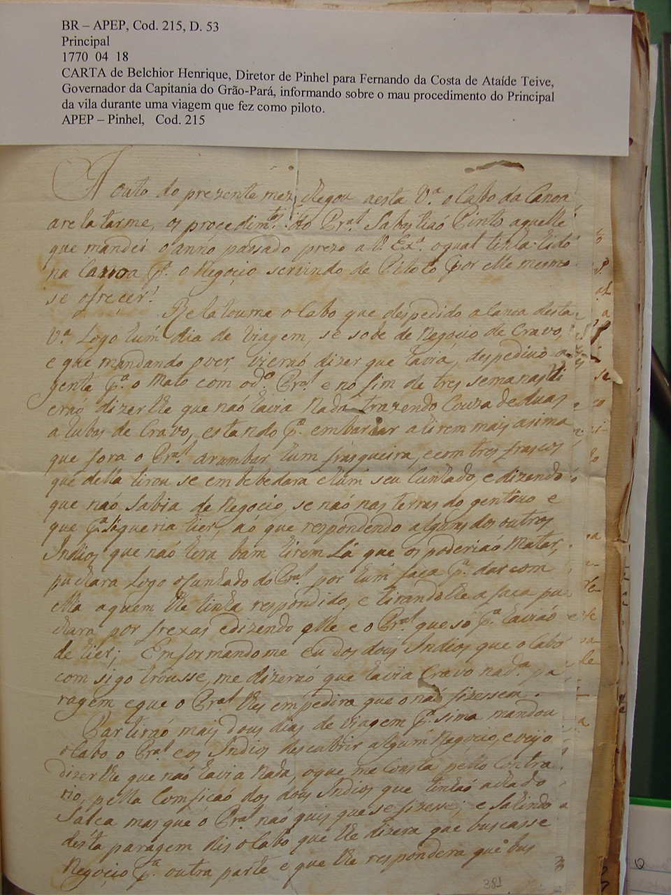 | Original archival document from the Arquivo Público do Estado do Pará (Codice 215, Document 53), photographed by me. See the second document in Set no. 3 for an English translation. |